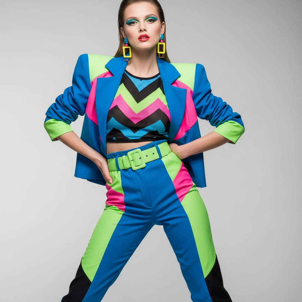 Misez sur les couleurs néon (rose fuchsia, vert électrique, orange fluo) avec des motifs géométriques et des matières synthétiques brillantes. Ce style s’inspire des clips musicaux de l’époque et de l’esthétique futuriste.